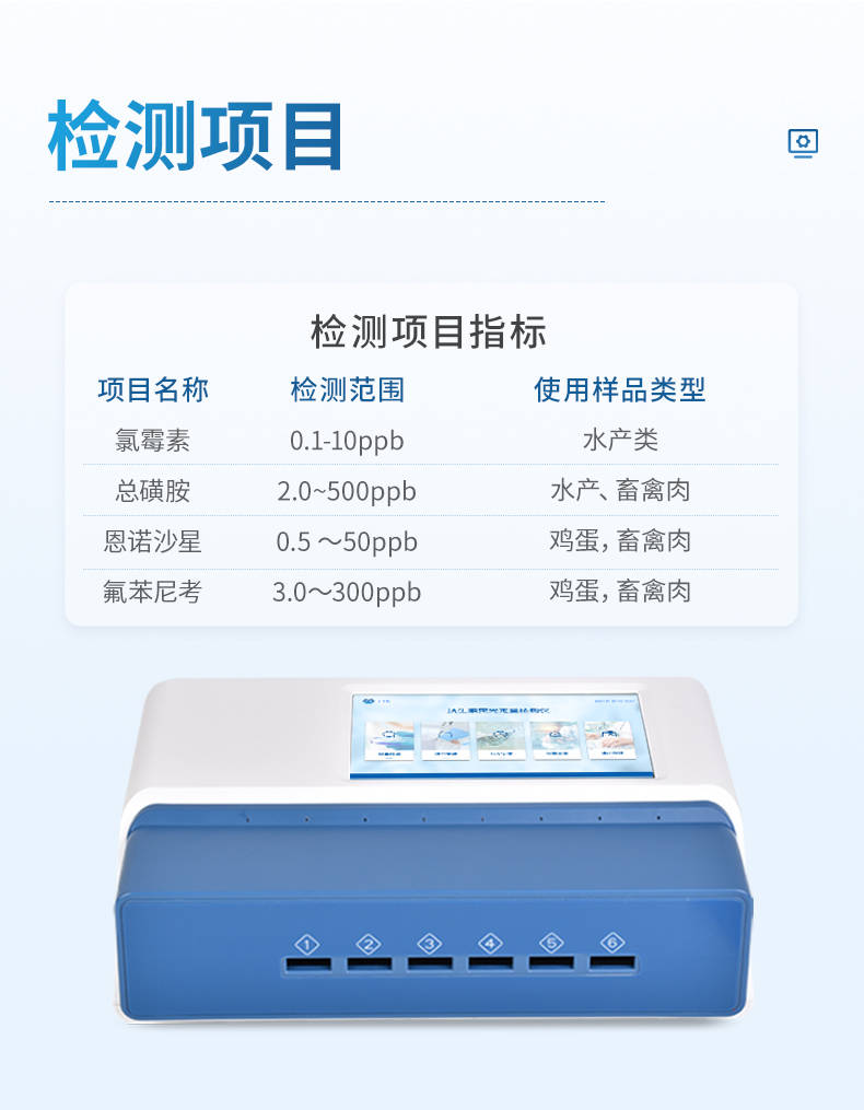 该设备适用于农贸市场、海鲜市场、食品肉产品深加工企业、食药监局、卫生部门、水产养殖场、检验检疫部门、农业部门、第三方检测机构等多个场景,核心聚焦水产品中抗生素残留检测。其轻量化便携设计可满足现场移动检测需求,集成化功能也适配实验室常规检测,能精准匹配不同单位的检测流程,是一款场景适配性极强的检测设备。